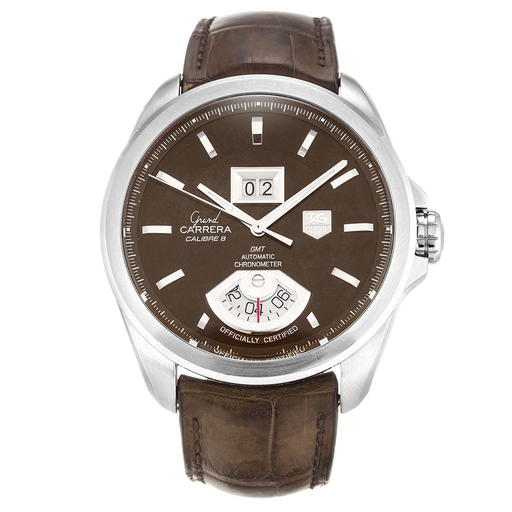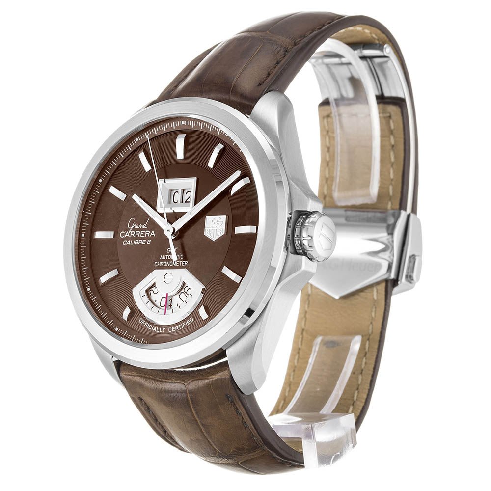 Men’s Grand Carrera WAV5113.FC6225 watches a 42 mm stainless steel case with a brown dial and a scratch-resistant sapphire crystal. Silver-tone luminescent hands and index hour markers. Minute markers around the outer rim. Date beneath the 12 o’clock position. Chronometer at 6 o’clock. Hands: hours, minutes, and seconds. Automatic movement and material crocodile brown bracelet