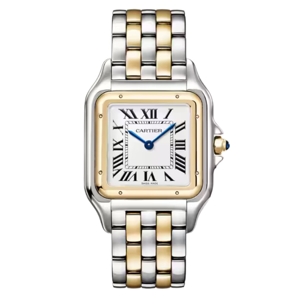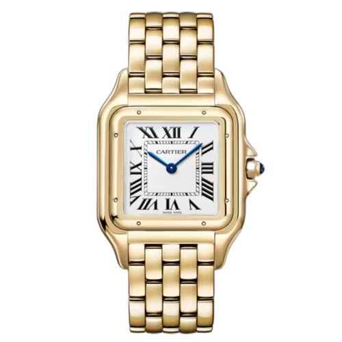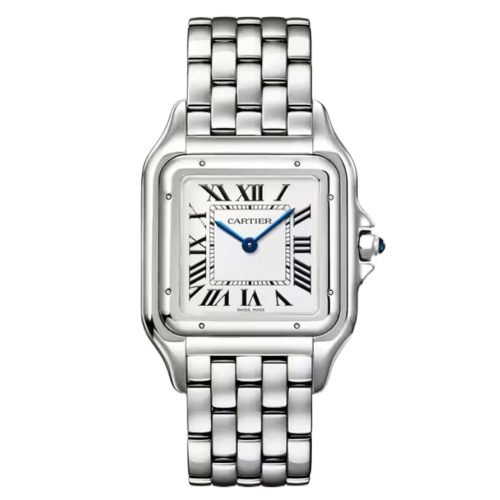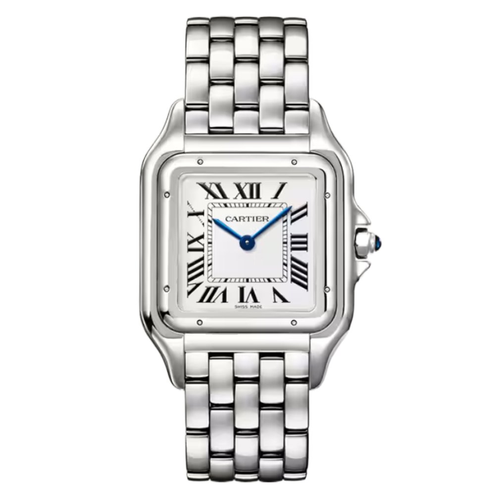 Panthère de Cartier watch, large model, quartz movement. Steel case, dimensions: 31 mm x 42 mm, thickness: 6.71 mm, steel case, crown with a blue synthetic spinel, silvered dial, blued-steel sword-shaped hands, steel bracelet. Water-resistant up to 3 bar (approx. 30 meters/100 feet).