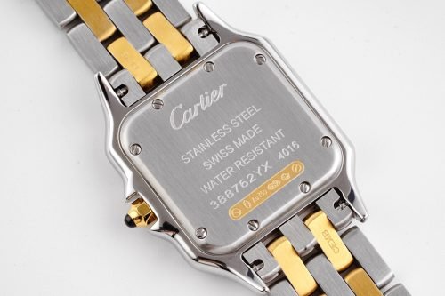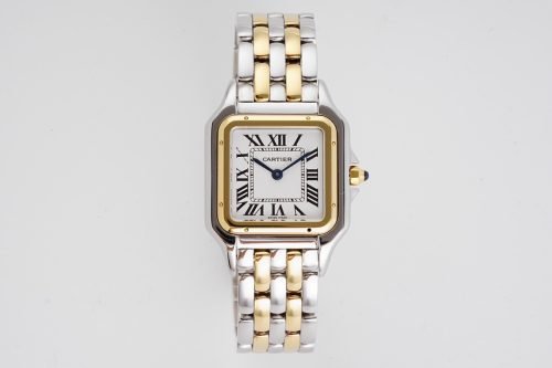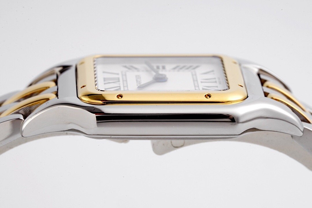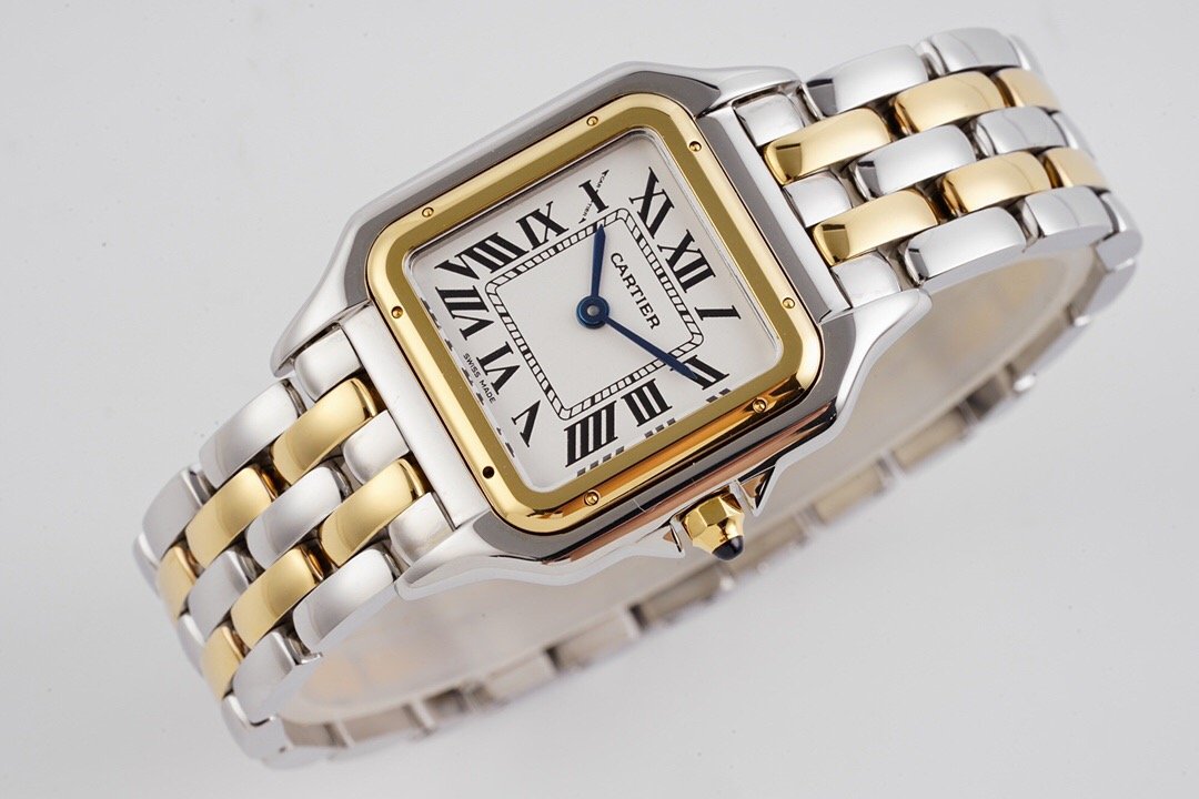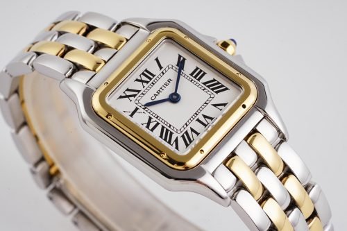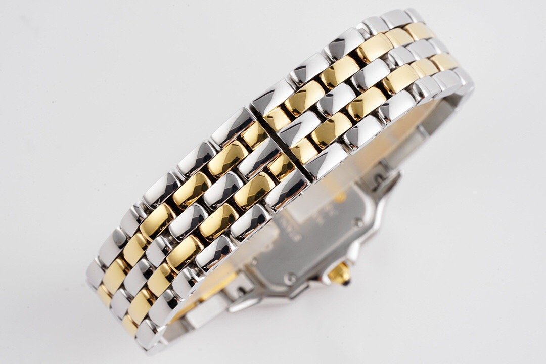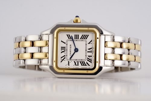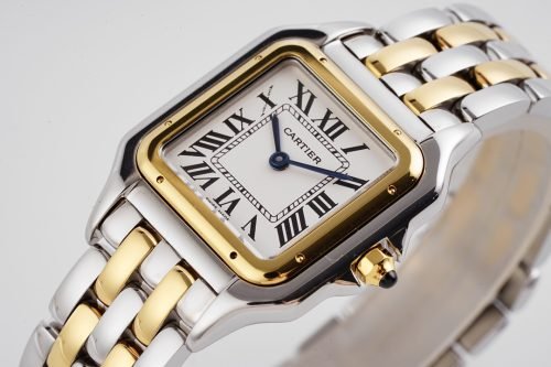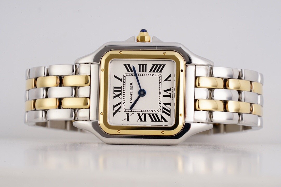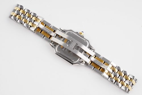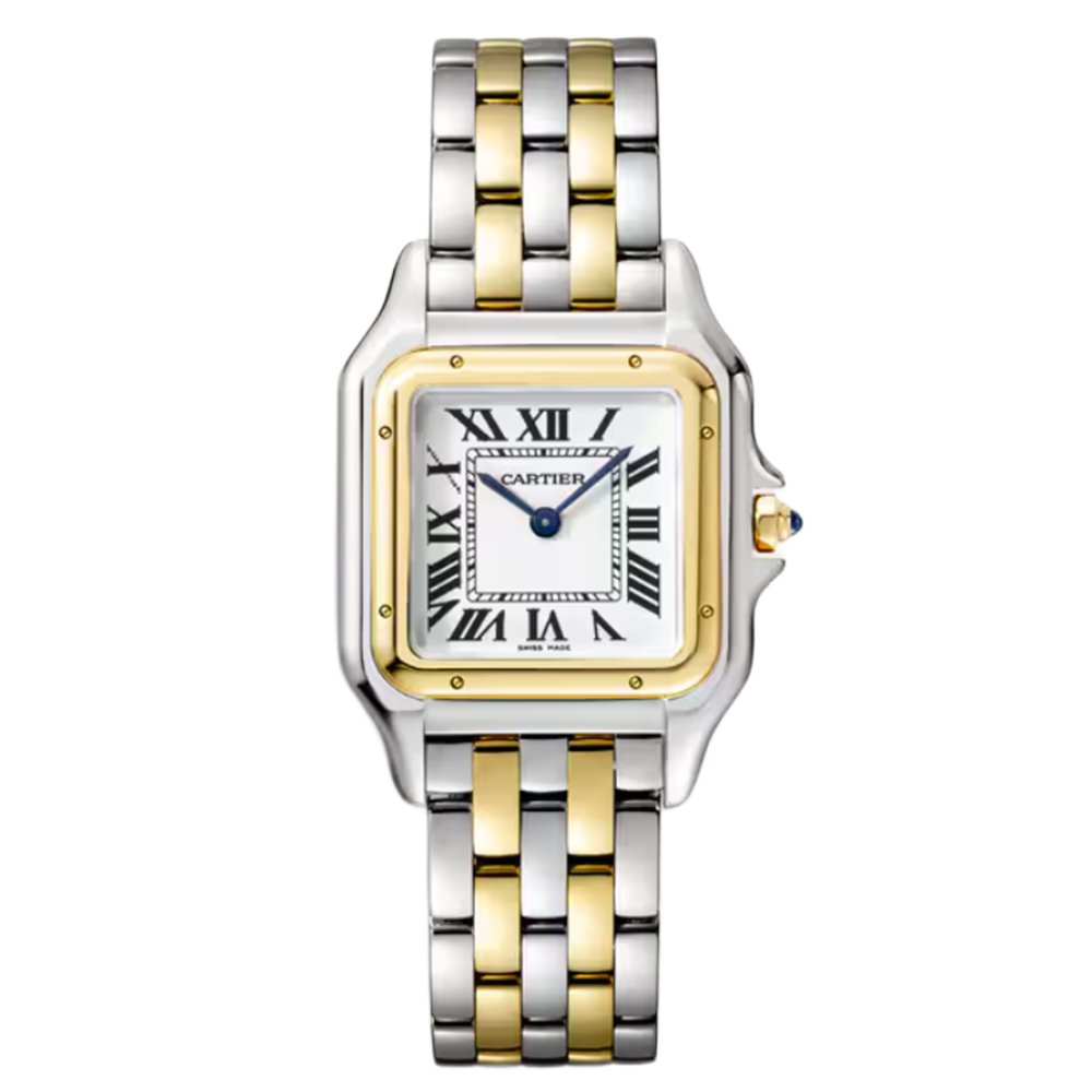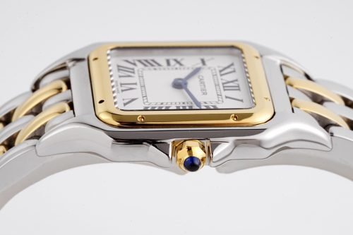Panthère de Cartier watch, medium model, quartz movement. Case in yellow gold 750/1000 and steel, dimensions: 29 mm x 37 mm, thickness: 6 mm, crown set with a synthetic blue spinel, silvered dial, blued-steel sword-shaped hands, bracelet in yellow gold 750/1000 and steel. Water-resistant to 3 bar (approx. 30 meters).
