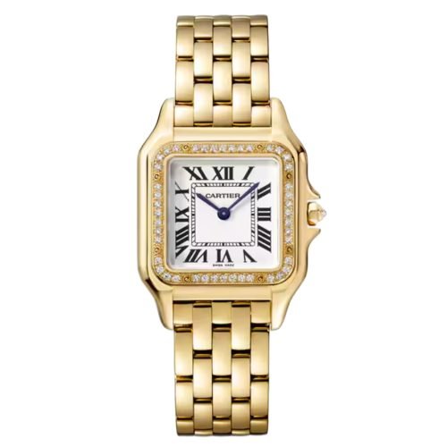 Panthère de Cartier watch, medium model, quartz movement. Case in yellow gold 750/1000, dimensions: 29 mm x 37 mm, thickness: 7 mm, crown set with a blue sapphire, silvered dial, blued-steel sword-shaped hands, yellow gold 750/1000 bracelet. Water-resistant to 3 bar (approx. 30 meters).