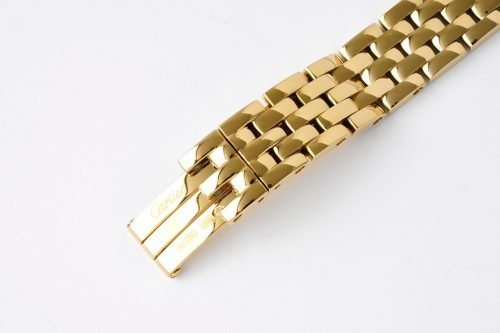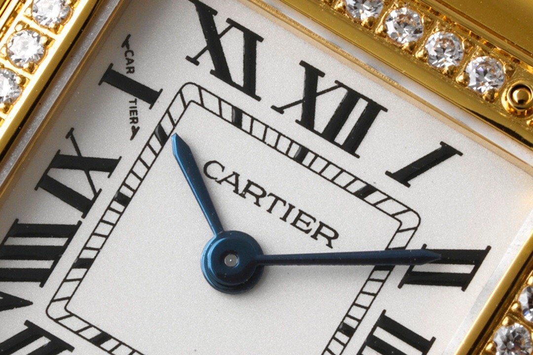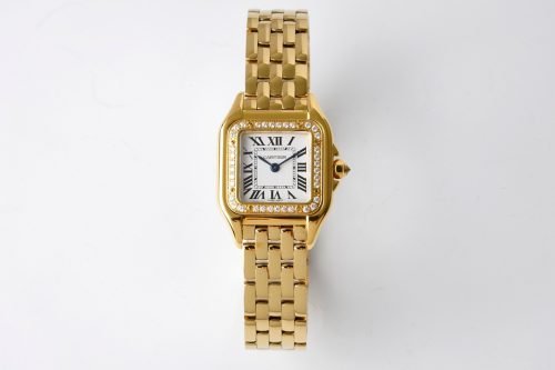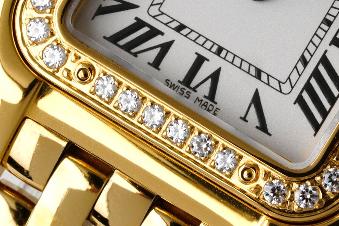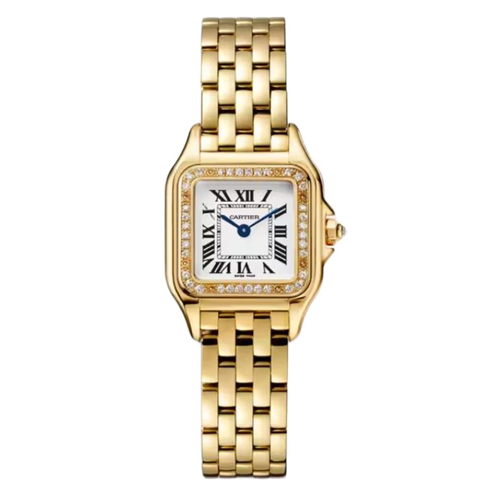 Panthère de Cartier watch, small model, quartz movement. Case in 18K yellow gold (750/1000) set with brilliant-cut diamonds, dimensions: 22 mm x 30 mm, thickness: 6 mm, crown set with a diamond, silvered dial, blued-steel sword-shaped hands, 18K yellow gold (750/1000) bracelet, water-resistant to 3 bar (approx. 30 meters). Non-contractual photo (the length of the watch strap may vary slightly).