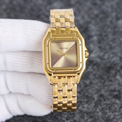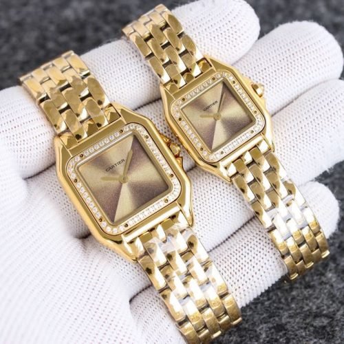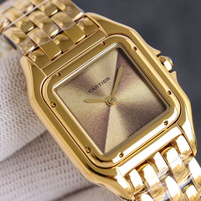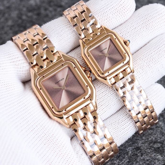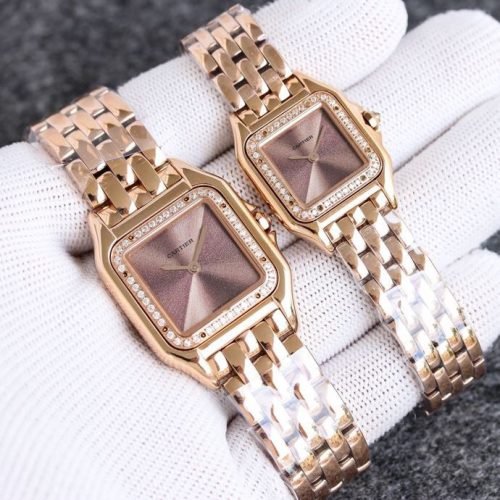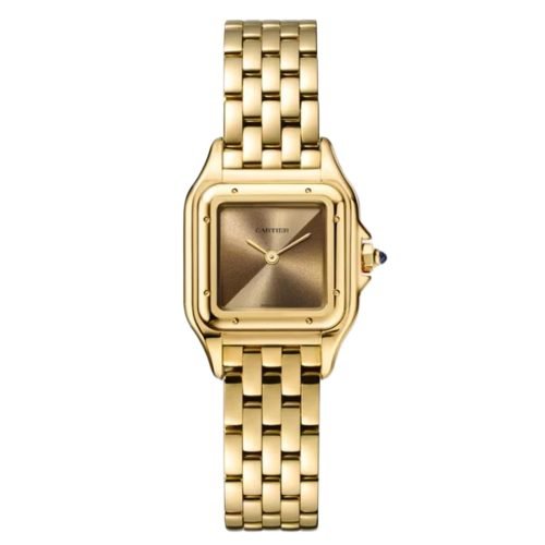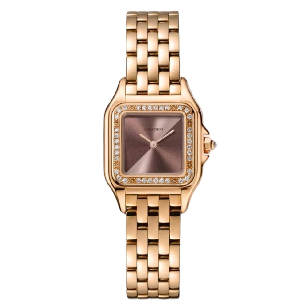 Panthère de Cartier watch, small model, quartz movement. Rose/yellow gold 750/1000 case and crown set with 37 brilliant-cut diamonds totaling 0.27 carat. Dimensions: 22 mm x 30 mm, thickness: 6 mm, dial with graded shades of golden plum and brown forming a diagonal in the center, sword-shaped hands, rose gold 750/1000 strap. Water-resistant up to 3 bar (approx. 30 meters/100 feet).