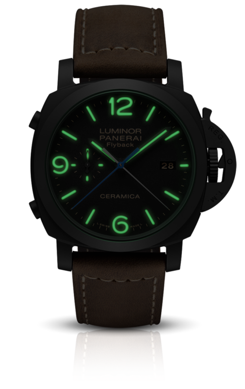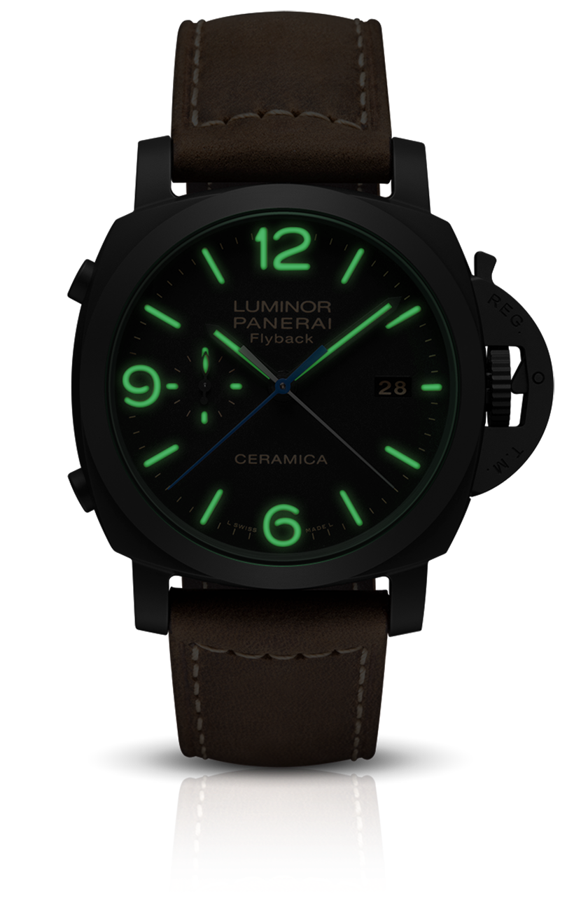 Dial:Black sandwich dial with luminous Arabic numerals and hour markers. Date at 3 o’clock, seconds at 9 o’clock, central chronograph seconds and minutes hands.