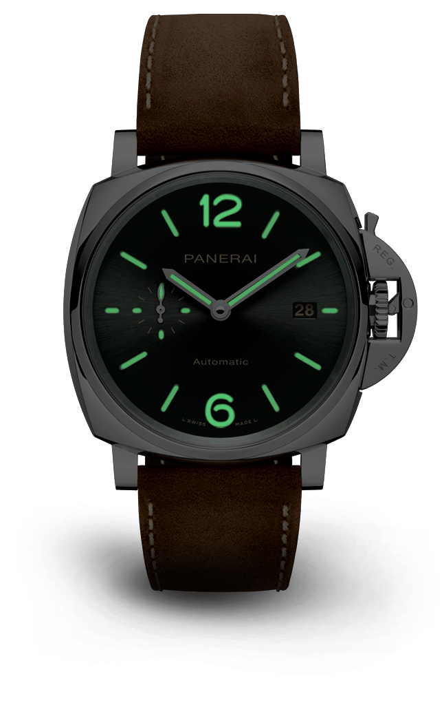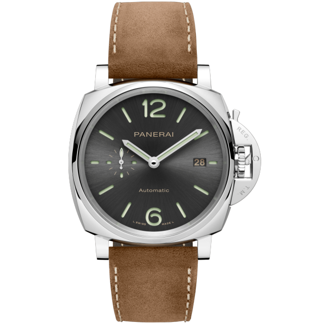 Dial:Sun-brushed anthracite with Arabic numerals and hour markers. Date at 3 o’clock and small seconds at 9 o’clock.