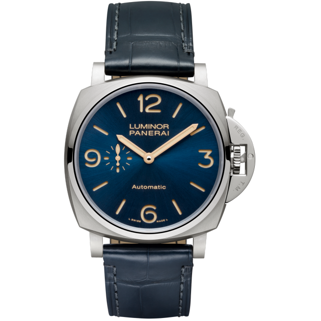 Dial:Sun-brushed blue with luminous Arabic numerals and hour markers. Small seconds at 9 o’clock.