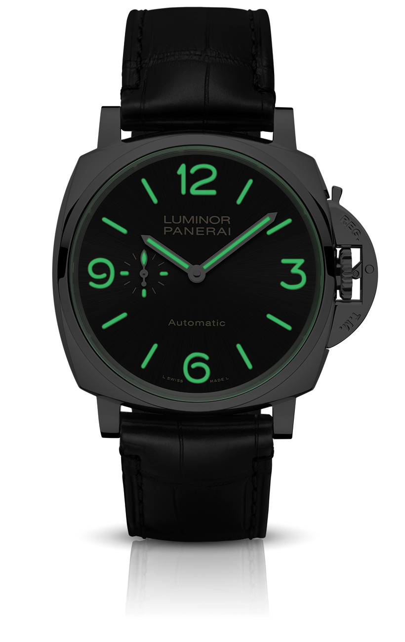 Dial:Sun-brushed black with luminous Arabic numerals and hour markers. Small seconds at 9 o’clock.