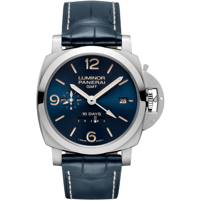 Dial:Blue sun-brushed dial with luminous Arabic numerals and hour markers. Date at 3 o’clock, seconds and 24h indicator at 9 o’clock, linear power reserve indicator at 6 o’clock