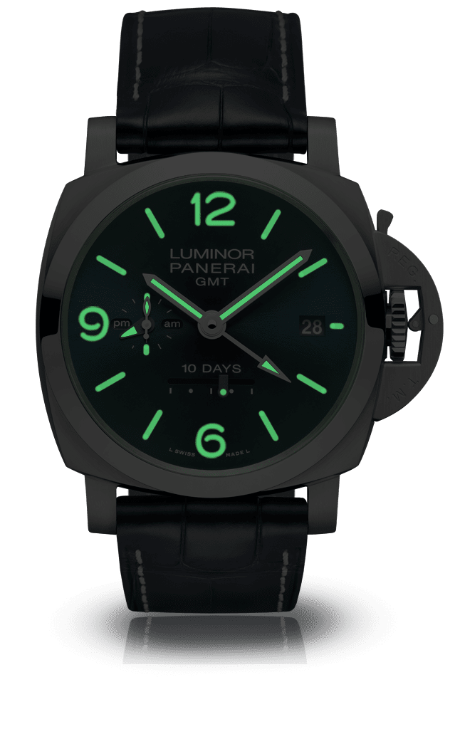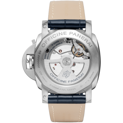 Movement: Automatic mechanical, Panerai P.2003 calibre,13¾ lignes, 8 mm thick, 25 jewels, Glucydur balance, 28,800 alternations/hour. KIF Parechoc anti-shock device. Power reserve 10 days, three barrels, seconds reset device. 296 components