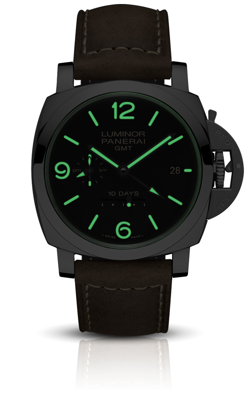 Dial:Black with luminous Arabic numerals and hour markers. Date at 3 o’clock, GMT indicator at 9 o’clock, linear power indicator at 6 o’clock.