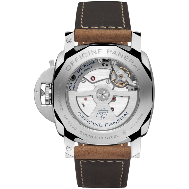 Movement:Automatic mechanical, Panerai P.2003 calibre,13¾ lignes, 8 mm thick, 25 jewels, Glucydur balance, 28,800 alternations/hour. KIF Parechoc anti-shock device. Power reserve 10 days, three barrels, seconds reset device. 296 components.