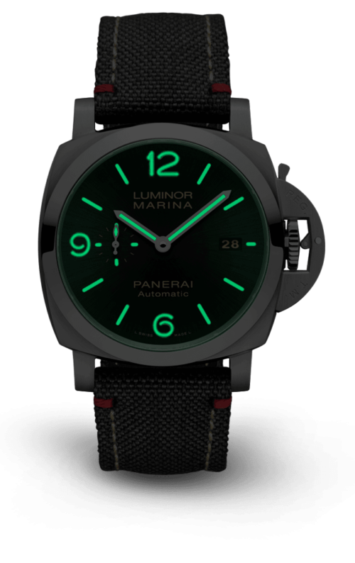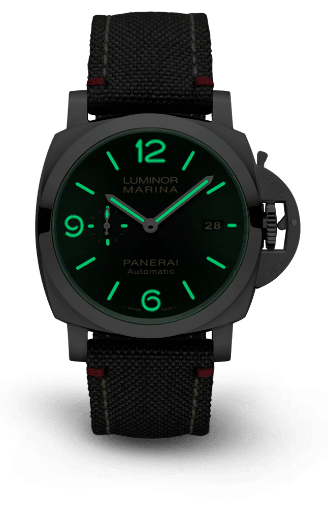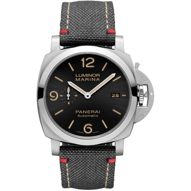 Dial:Black sun-brushed with luminous Arabic numerals and hour markers. Date at 3 o’cock, small seconds at 9 o’clock