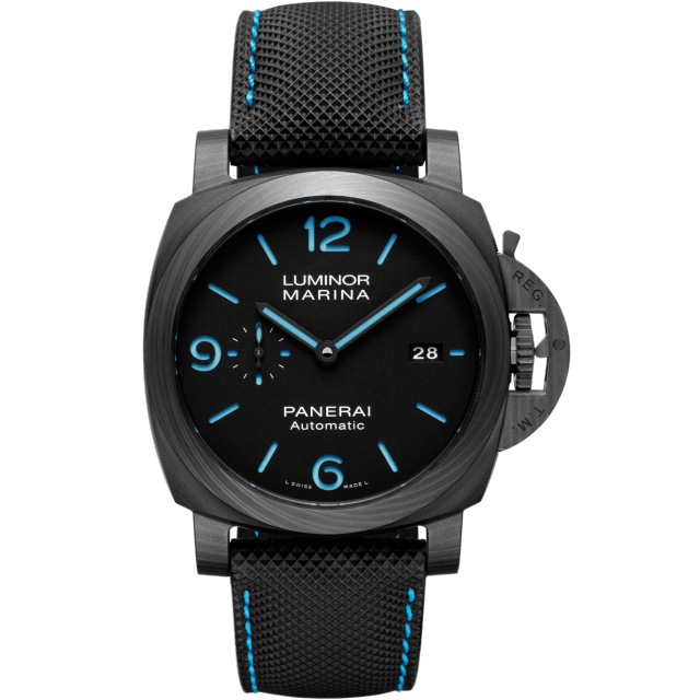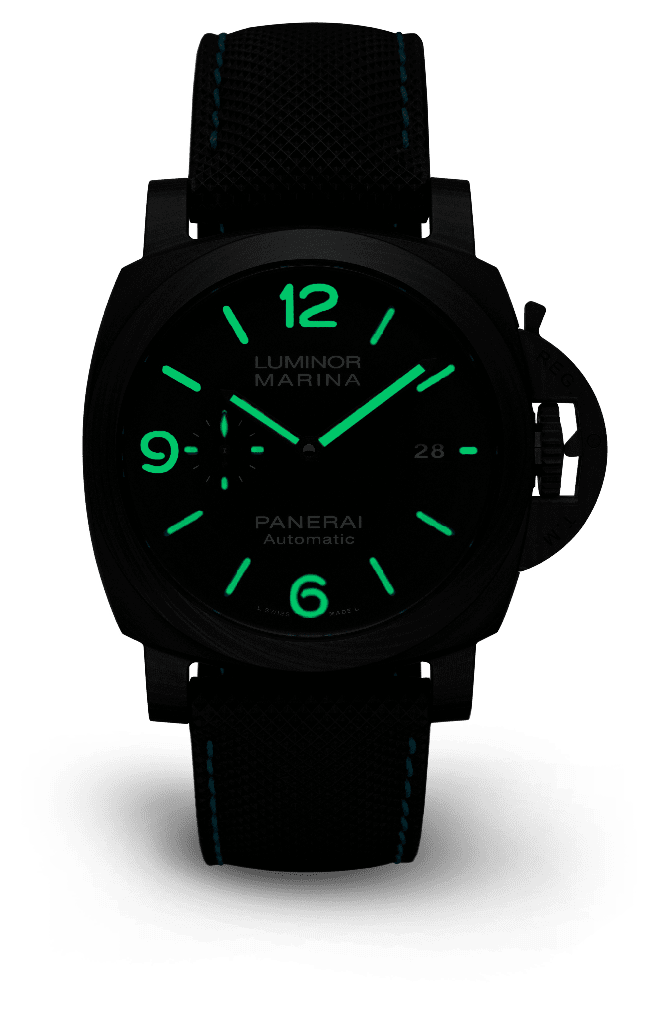 Dial:Black with luminous Arabic numerals and hour markers. Date at 3 o’clock and small seconds at 9 o’clock