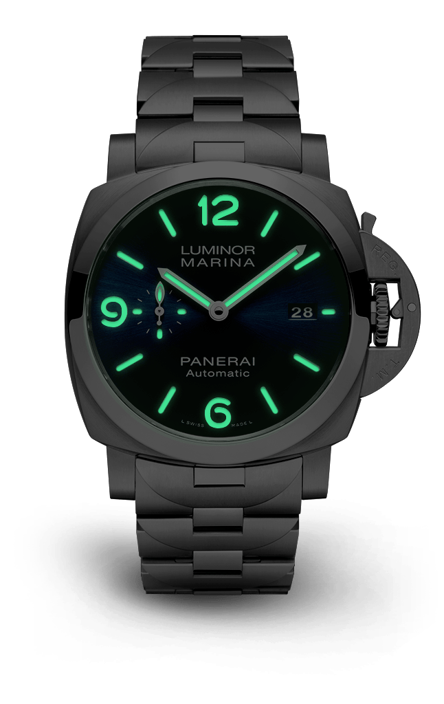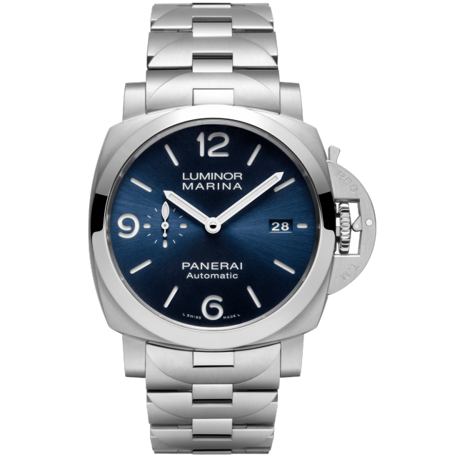 Dial:Blue sun-brushed with luminous Arabic numerals and hour markers. Date at 3 o’clock and small seconds at 9 o’clock