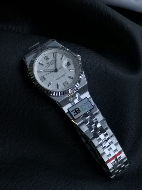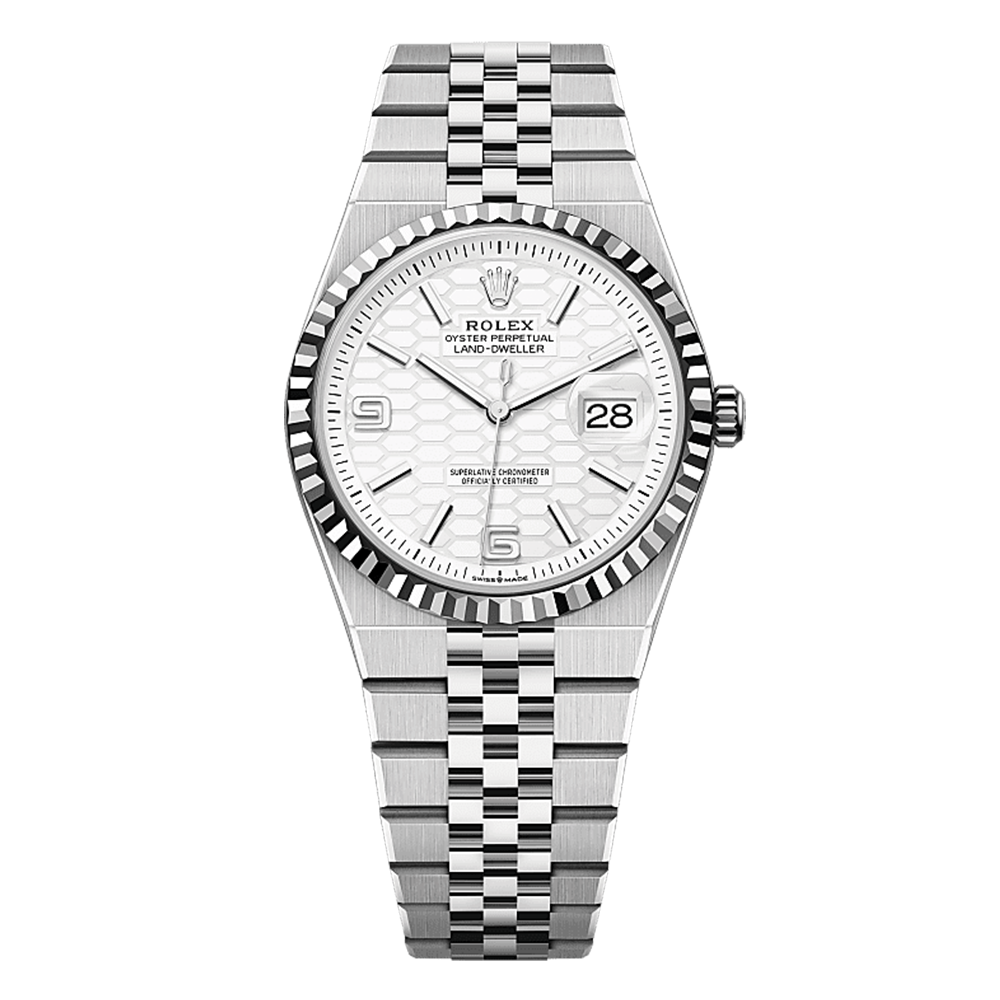 The Land-Dweller 36 in Oystersteel and white gold with an intense white, honeycomb-motif dial and Flat Jubilee bracelet.