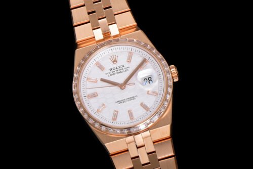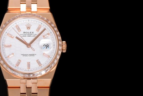 The Land-Dweller 36 in 18 ct Everose gold with an intense white, honeycomb-motif, diamond-set dial and Flat Jubilee bracelet.
