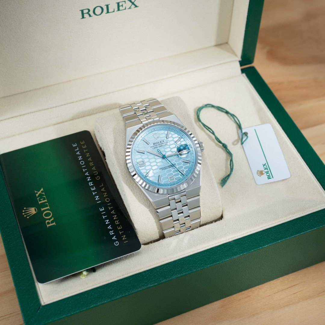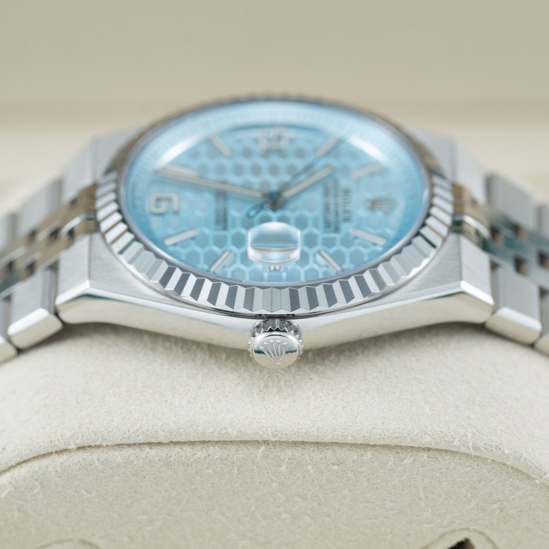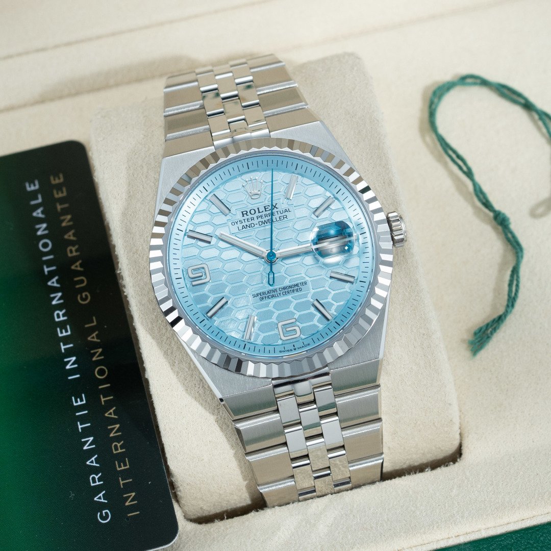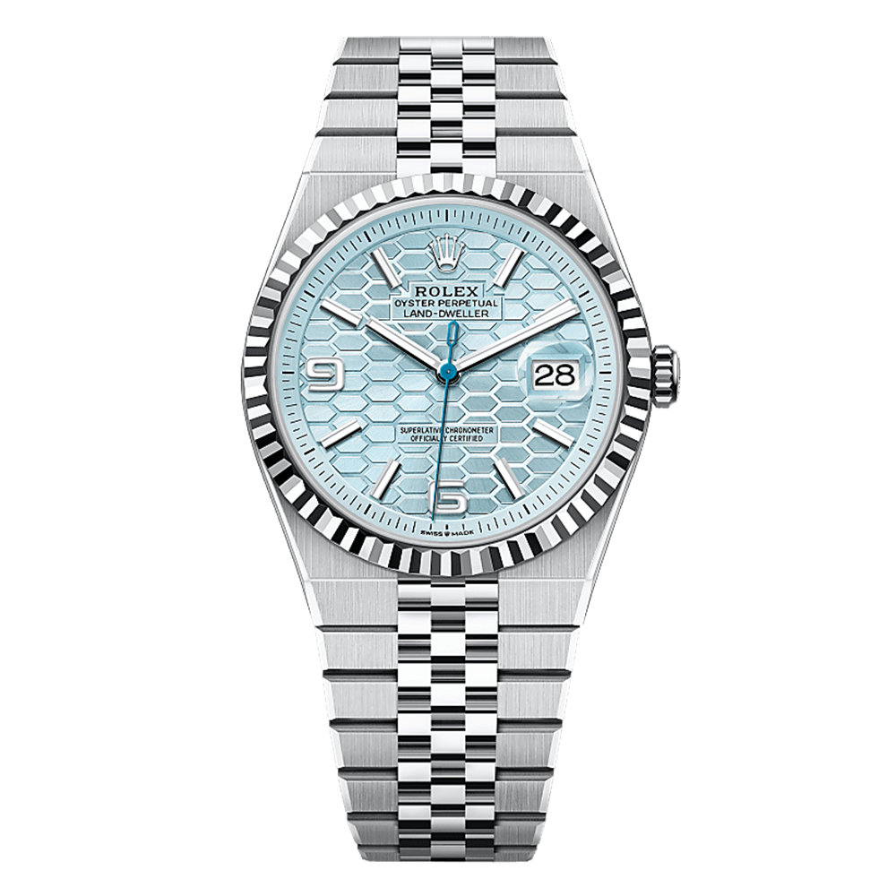 The Land-Dweller 40 in platinum with an ice-blue, honeycomb-motif dial and Flat Jubilee bracelet.