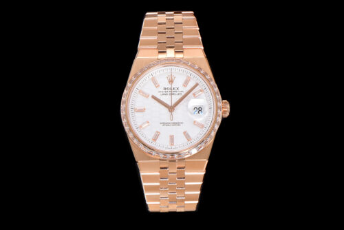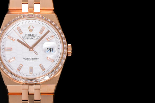 The Land-Dweller 36 in 18 ct Everose gold with an intense white, honeycomb-motif, diamond-set dial and Flat Jubilee bracelet.