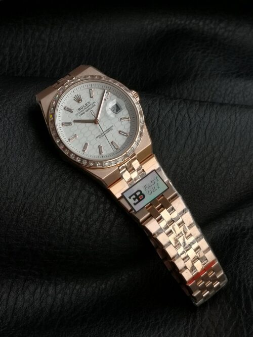 The Land-Dweller 40 in 18 ct Everose gold with an intense white, honeycomb-motif, diamond-set dial and Flat Jubilee bracelet.